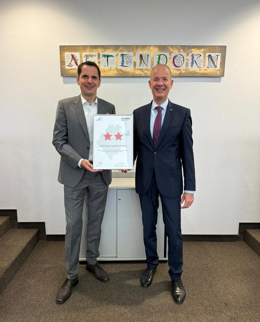 Als sichtbares Zeichen für den Erhalt des zweiten REGIONALE-Sterns überreichte der Landrat des Kreises Olpe, Theo Melcher, die entsprechende Urkunde an den Bürgermeister der Hansestadt Attendorn, Christian Pospischil. Denn ein Teilprojekt des Gesamtkonzepts treibt die Hansestadt Attendorn voran: "Biggesee digital und real erleben". Die Pläne sehen vor, am Biggesee einen neuen naturnahen Badebereich, ein Netzwerk an Nordic-Walking-Strecken sowie eine digitale Erlebniswelt zu schaffen.
