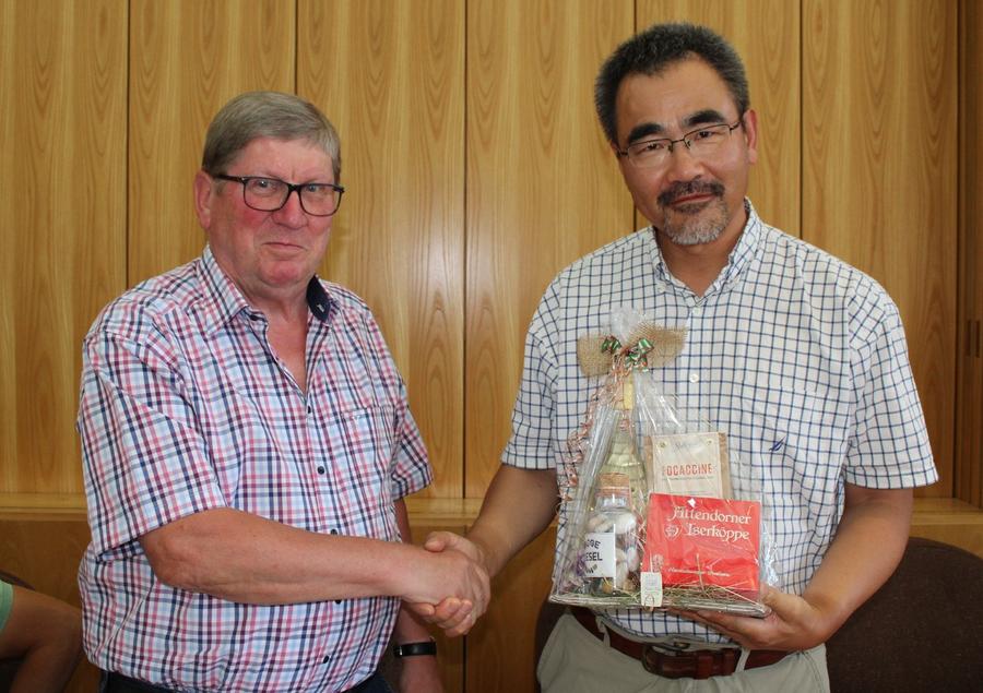 Direktor Ma Shan zeigte sich sehr gerührt über diese anerkennenden Worte und über das Geschenk mit kulinarischen Köstlichkeiten aus Attendorn, welches er aus den Händen von Horst Peter Jagusch sowie Natalie Richard und Tom Kleine von der Hansestadt Attendorn erhielt.
