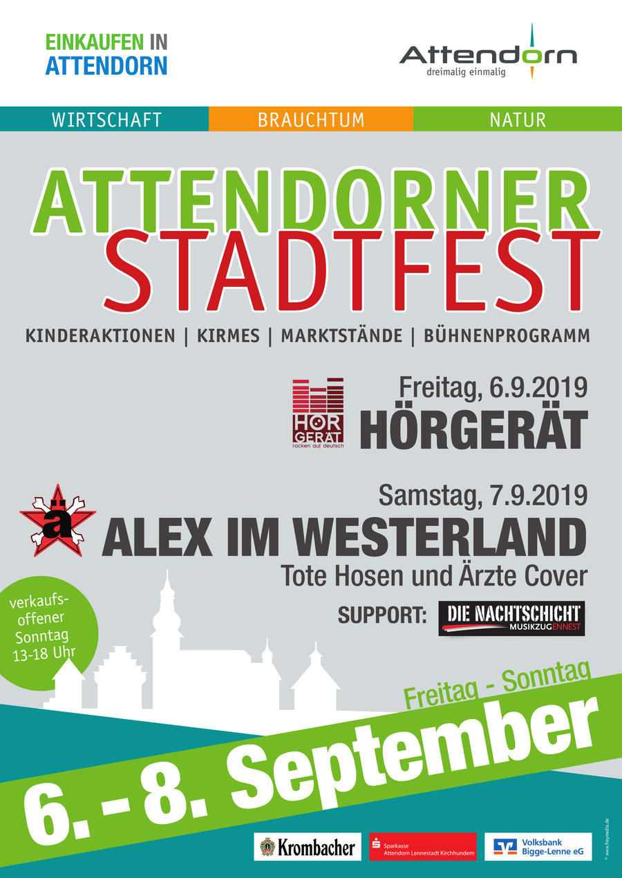 Vom 6. bis 8. September 2019 findet das Attendorner Stadtfest statt. Auf drei Bühnen gibt es ein abwechslungsreiches Programm. Und auf den Straßen ist jede Menge los. Der Sonntag ist verkaufsoffen.