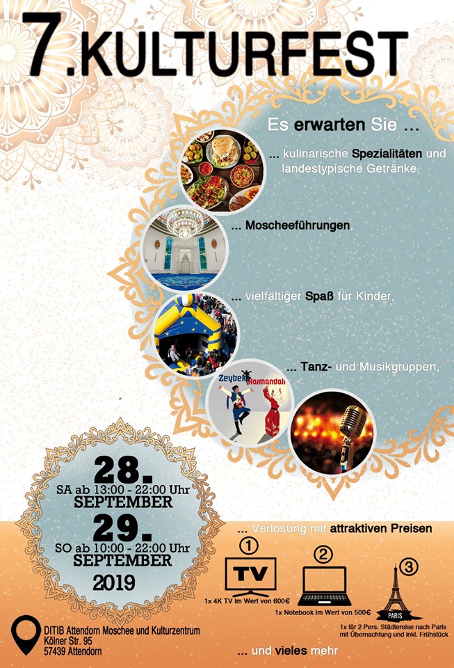 Das Attendorner Moschee- und Kulturzentrum lädt am Samstag, 28. und Sonntag, 29. September 2019, zum 7. Kulturfest auf das Parkgelände rund um die Moschee an der Kölner Straße 95 ein.