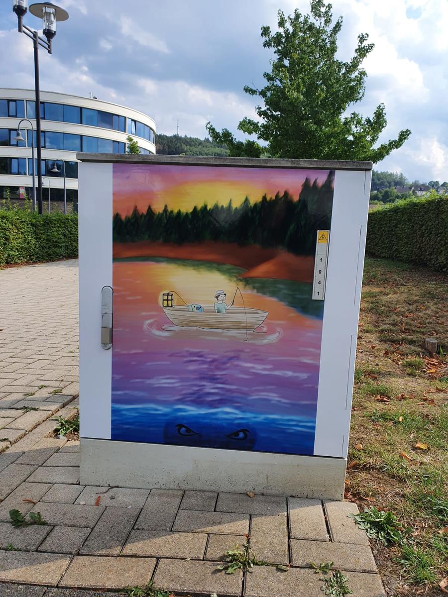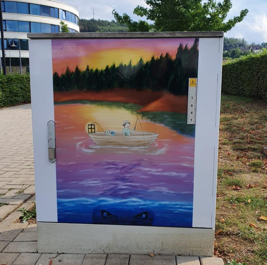 Ivon Primorac entschied sich für ein Bild eines Anglers auf dem Biggesee. Dieses Werk ziert den Stromkasten im Bereich Hanse Hotel und JAC Kino.