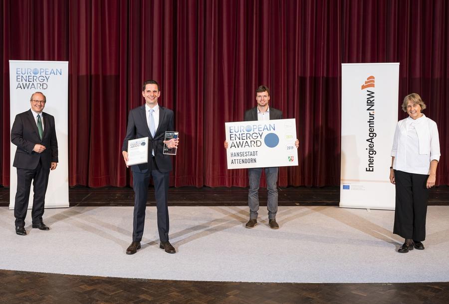 Bürgermeister Christian Pospischil und Robert Feiler, Energieteamleiter der Hansestadt Attendorn, nahmen bei der Preisverleihung in Soest die Ehrung durch den Geschäftsführer der EnergieAgentur.NRW Lothar Schneider und Ilga Schwidder, Geschäftsführerin der Bundesgeschäftsstelle European Energy Award, persönlich entgegen.