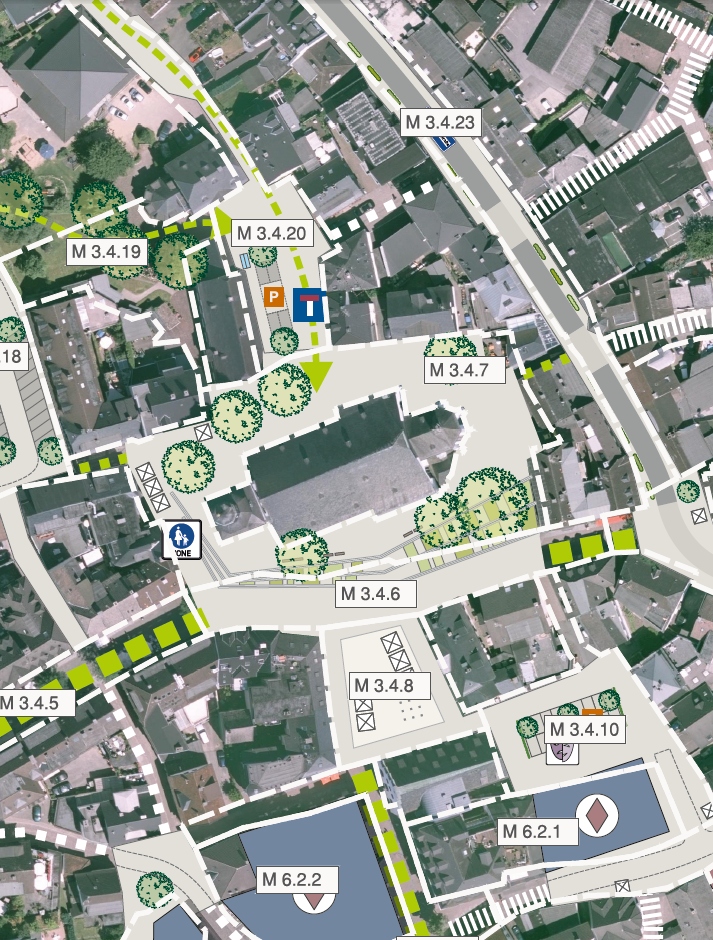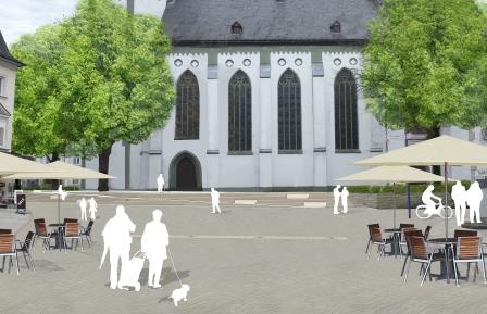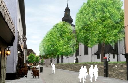 Der Kirchplatz erhält zur Steigerung der Aufenthaltsqualität eine offene Platzgestaltung mit Freitreppenanlage. Durch Licht- und Sitzelemente sowie Grün- und Heckenelemente wird ein attraktiver Raum geschaffen. Die Fortsetzung der Fußgängerzone stellt die Verbindung zwischen Kirchplatz und Marktplatz mit der Niedersten Straße dar und wird künftig die Aufgabe übernehmen, beide Plätze zusammenzufassen.