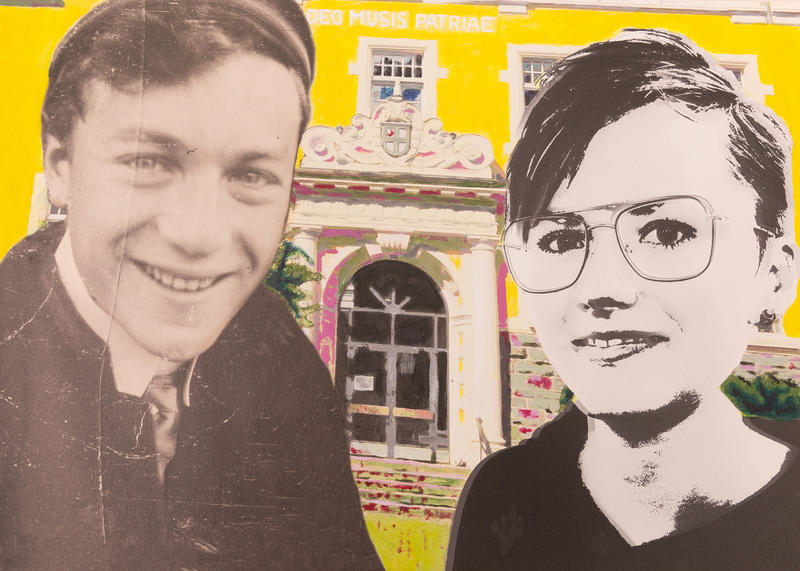 Pauline Hillesheim setzte das Eingangsportal des Rivius Gymnasium künstlerisch in Szene: "Ich habe die Patenschaft für Julius Böheimer übernommen. Uns beide verbindet, dass wir Schüler auf dem Rivius Gymnasium waren. Er hat den Holocaust dank Freunden in einem Versteck im Bergischen Land überlebt."
