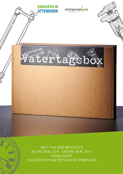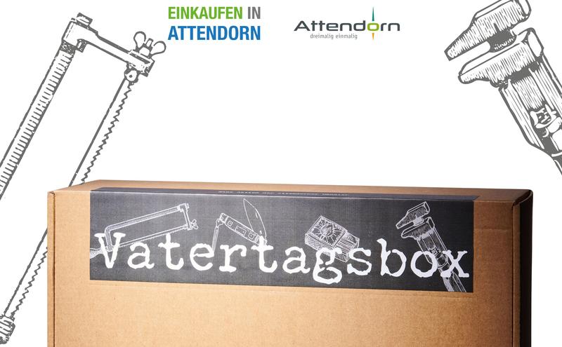 Mit der "Vatertags-Box" bietet der Attendorner Handel als Pendant zur "Muttertags-Box" ein exklusives Geschenk zum Vatertag am 13. Mai 2021 an. Als Gemeinschaftsprojekt der Hansestadt Attendorn und der Werbegemeinschaft Attendorn e.V. wird die Box mit ausgewählten und hochwertigen Produkten des örtlichen Handels gefüllt. Zwei Varianten sind erhältlich: die kleine Box zum Preis von 25 Euro und eine größere Box zum Preis von 50 Euro.