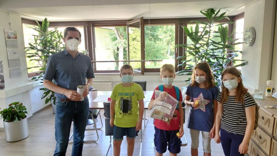 Attendorns Bürgermeister Christian Pospischil erhielt Besuch im Rathaus von vier Kindern aus Ennest, die ihm 301,50 € für die Flutopferhilfe übergaben.