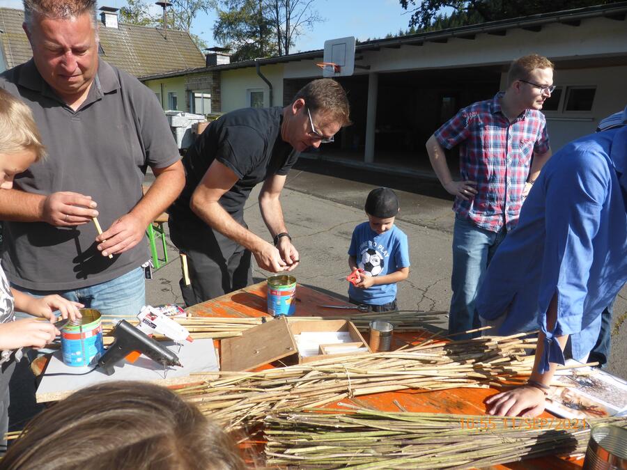 In einem Bereich wurden Halme verschiedener Pflanzen wie Brennnessel, Distel, Schilf usw. zunächst auf die richtige Länge gekürzt und dann in Dosen gebündelt. Dabei musste darauf geachtet werden, dass die Halme im hinteren Bereich geschlossen sind, sowie an den Schnittkanten nicht gequetscht wurden oder splitterten, da diese sonst nicht von den Bienen angenommen werden.