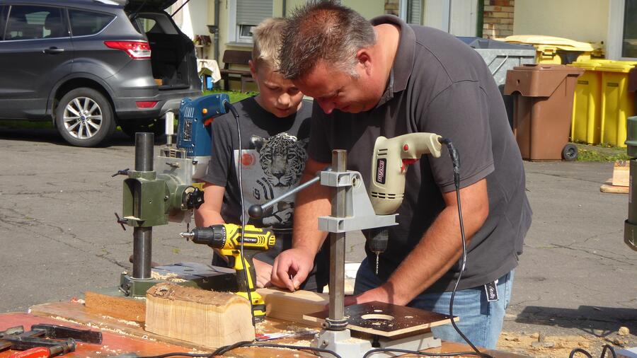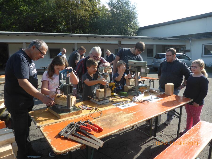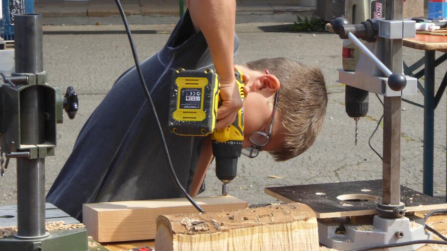 In dem dritten Arbeitsbereich wurde dann mit Holz gearbeitet. In vorbereitete Hölzer wurden Löcher in verschiedenen Größen gebohrt. Wichtig dabei war, dass die Löcher sehr sauber gebohrt wurden und nicht ausfransten, da sonst die empfindlichen Flügel der Wildbienen beschädigt werden können. Die Ansätze der Bohrlöcher mussten mit Senkern und Schleifpapier nachgearbeitet werden. Hier konnte sich jedes Kind auch einen Holzklotz anfertigen, den es mit nach Hause nehmen konnte, um damit den Grundstein für ein eigenes Wildbienenhotel zu legen. Zusätzlich konnte sich auch jedes Kind ein Tütchen Wildblumensamen mitnehmen, um zu Hause eine kleine Wildblumenwiese anzulegen.