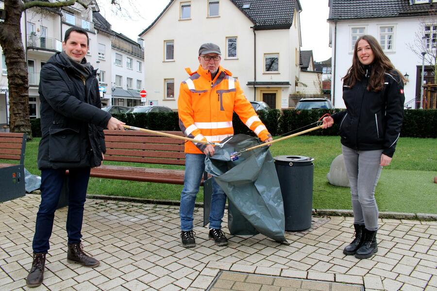 Bürgermeister Christian Pospischil, Karl Schulte vom Baubetriebshof und Chiara Sopart freuen auf eine rege Teilnahme: "Gerade in unserem Jubiläumsjahr möchten wir unsere Stadt gemeinsam herausputzen!"