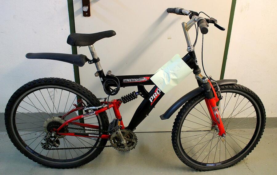 Beschreibung: Herren Mountainbike in schwarz/blau mit blauem Zahlenschloss und starken Gebrauchsspuren.