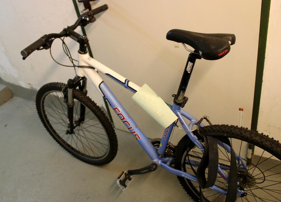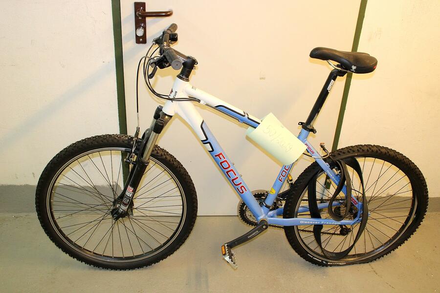 Beschreibung: Mountainbike Marke "Fokus" in blau/weiß. Reifen hinten platt, sonst guter Zustand.