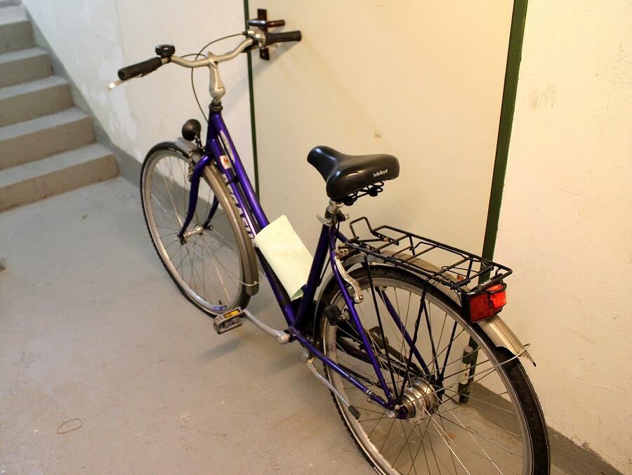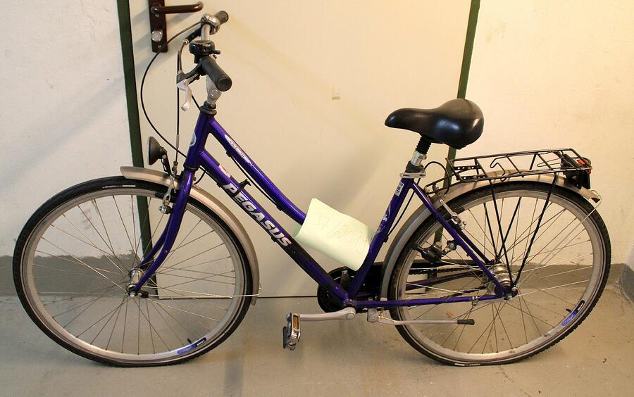 Beschreibung: Fahrrad Marke "Pegasus" in lila mit starken Gebrauchsspuren. Reifen vorne und hinten platt.