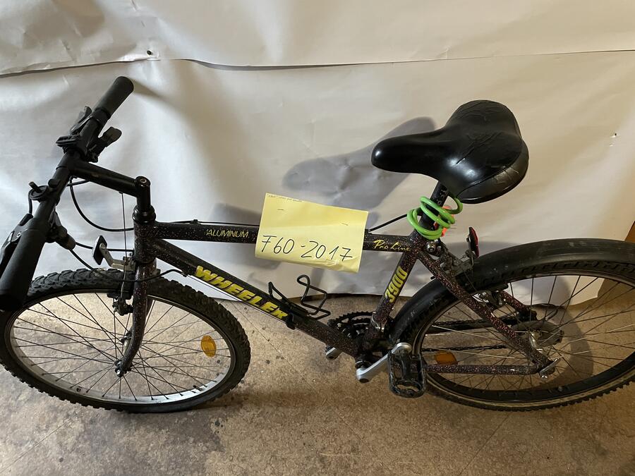 Beschreibung: Fahrrad Marke "Wheeler 3900" Aluminium Proline in schwarz mit pinkfarbenen Punkten, Aufschrift in Gelb. Mit Getränkeflaschenhalter und grünem Fahrradschloss. Reifen vorne platt. Leichte Gebrauchsspuren.