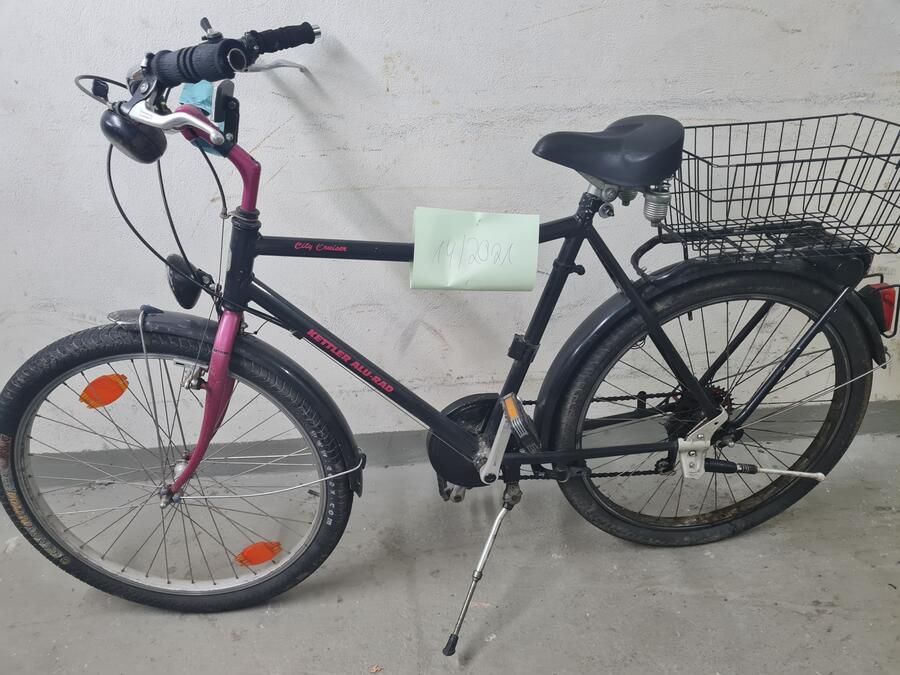 Beschreibung: Fahrrad Marke "Kettler Alu-Rad" City Cruiser in schwarz/pink. Schwarzer Fahrradkorb hinten. Starke Gebrauchsspuren.