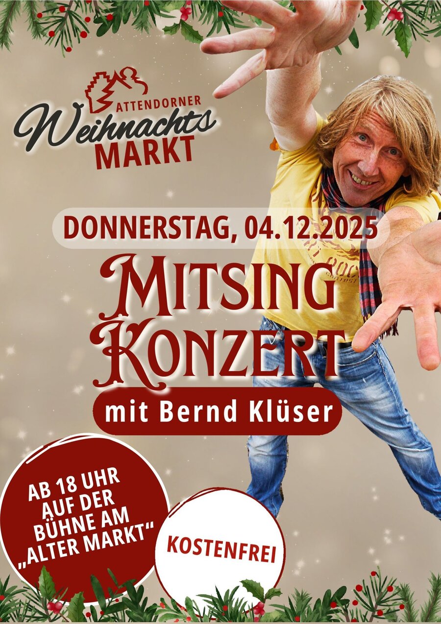 Nach der positiven Resonanz im vergangenen Jahr gibt es in Attendorn auch 2025 am Donnerstag, 4. Dezember 2025, dem Vorabend der Weihnachtsmarkt-Eröffnung, ein Mitsingkonzert mit dem Musiker Bernd Klüser.