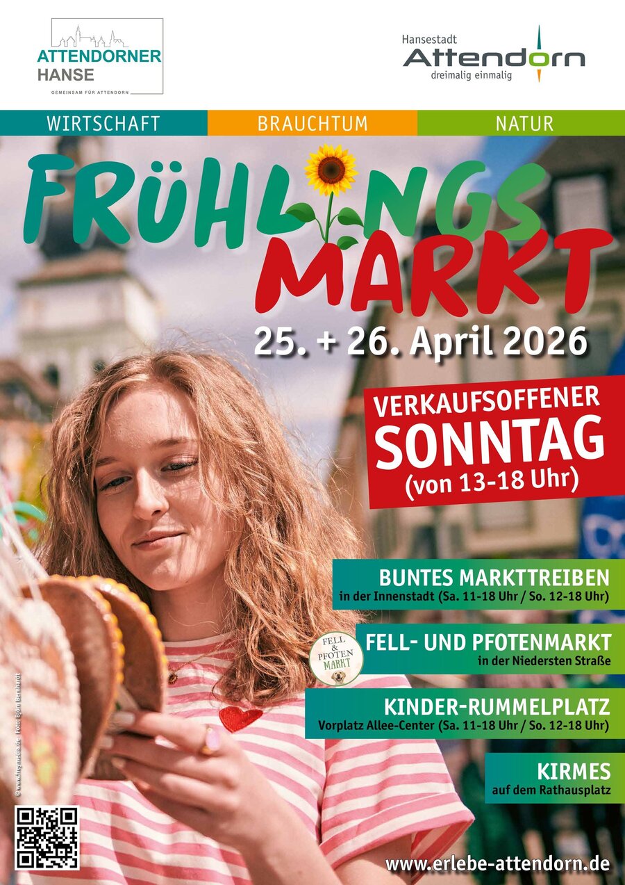 Die Hansestadt Attendorn lädt gemeinsam mit der Attendorner Hanse am Samstag und Sonntag, 25. und 26. April 2026, zum traditionellen Frühlingsmarkt in die Innenstadt ein. Besucherinnen und Besucher erwartet ein abwechslungsreiches Wochenende mit vielfältigen Aktionen für die ganze Familie, einem verkaufsoffenen Sonntag sowie dem beliebten Fell- und Pfotenmarkt.
