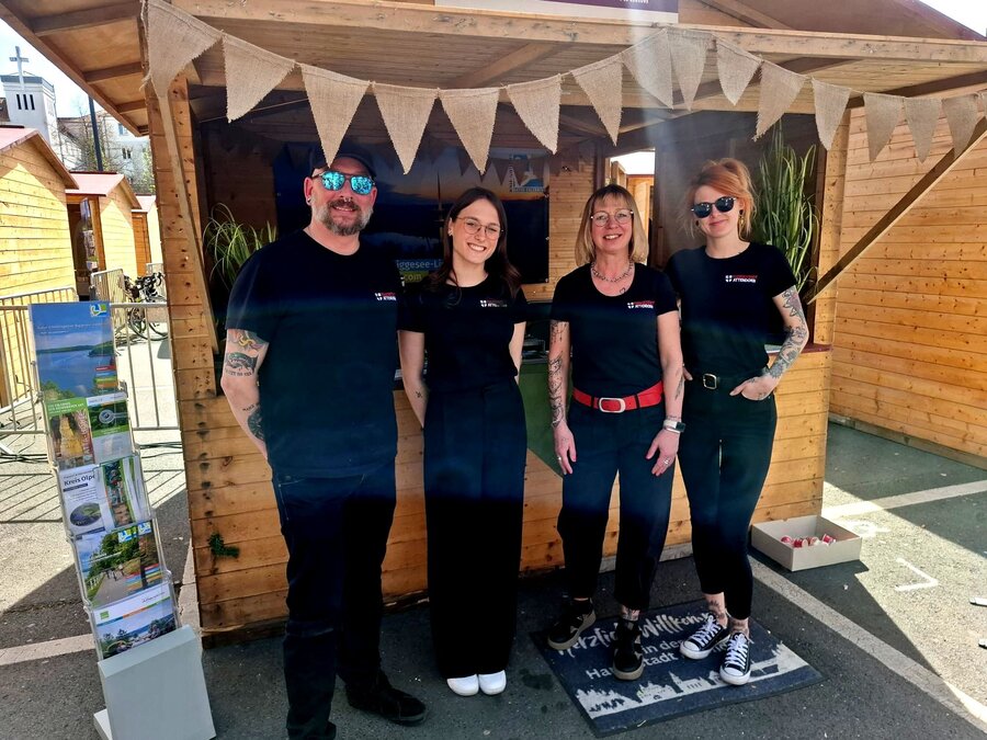 Auch die Hansestadt Attendorn war auf dem Hansemarkt präsent: Das Kulturteam des Rathauses mit Madeleine Willmes, Michael Rösk, Dunja Bonacker und Selina Heinrich informierte zwei Tage lang an einem eigenen Stand über die Hansestadt und rührte die Werbetrommel für Attendorns kulturelle und touristische Angebote.