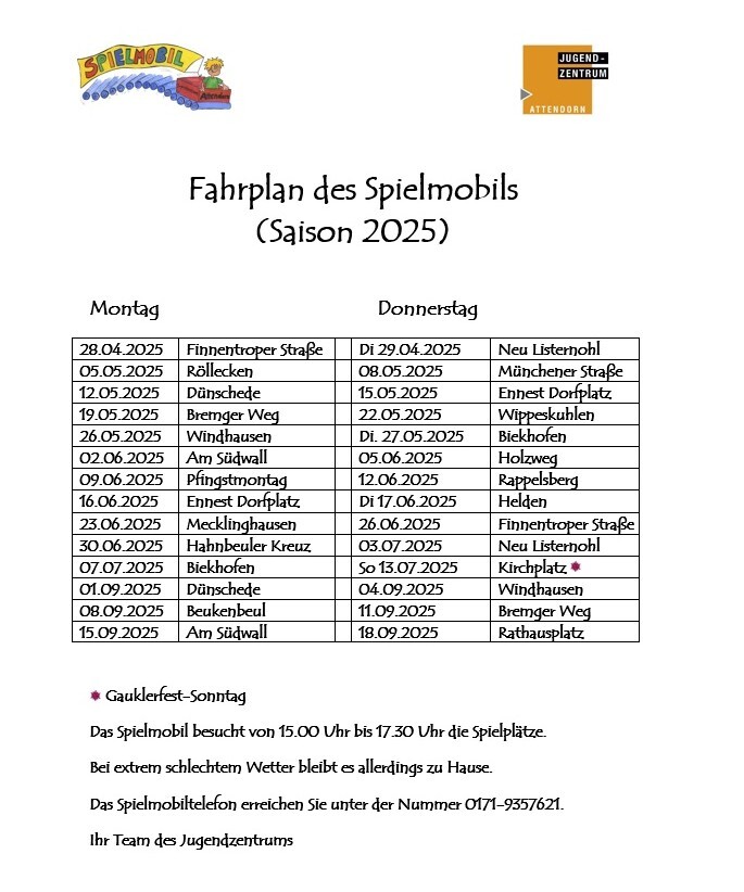 Ab Montag, 28. April 2025, geht das Spielmobil des Jugendzentrums Attendorn wieder auf Tour. In den Sommermonaten besucht das Spielmobil traditionell verschiedene Spielplätze in und um Attendorn und begeistert dort die Kinder mit einem vielfältigen Angebot an Spielgeräten und Aktionen.