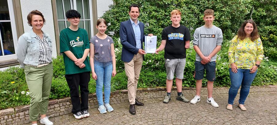 Attendorns Bürgermeister Christian Pospischil nahm aus den Händen einer Schülergruppe das Ergebnis einer Umfrage zum Thema „Klimaschutz in Attendorn aus der Sicht von Jugendlichen“ entgegen.