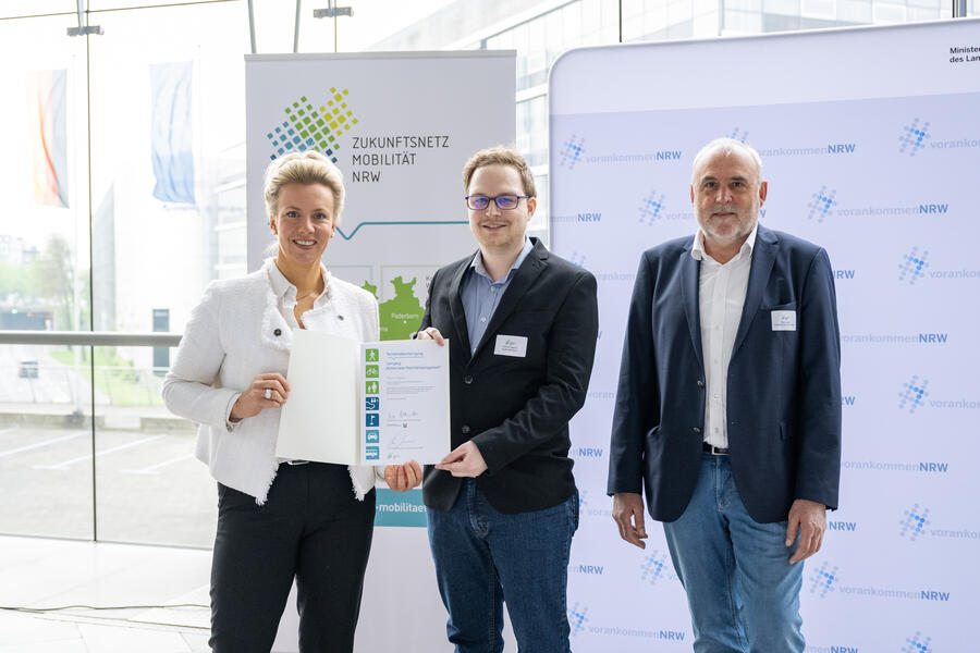 Für seine erfolgreiche Teilnahme am Lehrgang „Kommunales Mobilitätsmanagement“ des Zukunftsnetz Mobilität NRW überreichte die Verkehrsministerin des Landes Nordrhein-Westfalen, Ina Brandes, Patrick Dippler seine Urkunde.