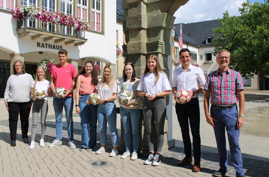 Mit Fußbällen unter dem Arm erschienen Attendorns Bürgermeister Christian Pospischil, Personaldezernent Christoph Hesse und Ausbildungsleiterin Irina Saggel zur Begrüßung der neuen Nachwuchskräfte im "Tor" des Franziskanerportals vor dem Rathaus: "Ihr seid ab sofort für die Bürgerinnen und Bürger unserer Stadt am Ball!"