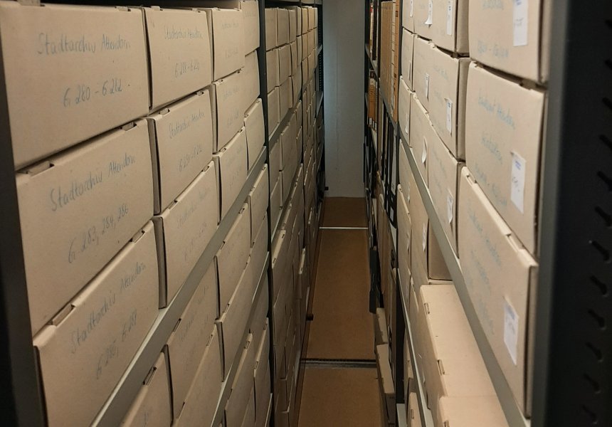 Bei den Archivführungen gibt es die einmalige Gelegenheit, die Räume des Historischen Magazins, die Fotothek und die Räume für die Deposita und Schenkungen kennenzulernen. Die Zahl der Teilnehmerinnen und Teilnehmer ist bei den Archivführungen auf acht Personen begrenzt. Treffpunkt hier ist der Rathauseingang am Schüldernhof.