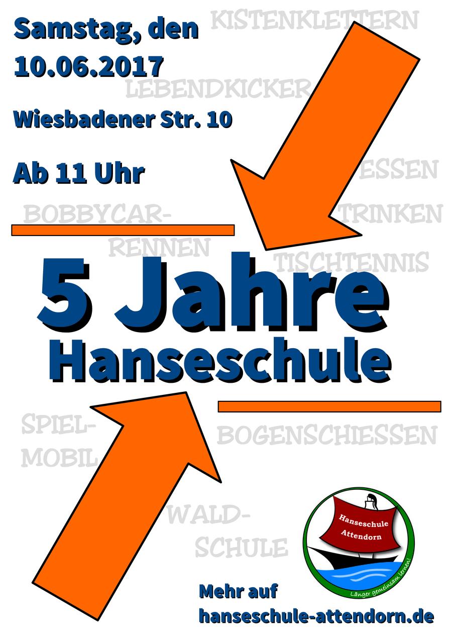 "Am kommenden Samstag, den 10.06.2017, feiert die Hanseschule von 11.00 Uhr bis 16.00 Uhr auf dem gesamten Schulgelände der Hanseschule an der Wiesbadener Str. 10 ihr fünfjähriges Bestehen.