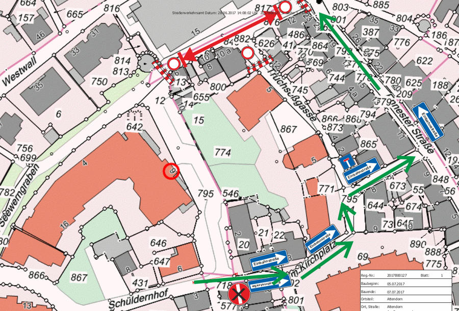 Für die Dauer der Vollsperrung wird der Anliegerverkehr des Bereiches Am Kirchplatz/Truchseßgasse ab Schüldernhof im Einrichtungsverkehr über die Straße Am Kirchplatz in Richtung Ennester Straße und weiter zur Windhauser Straße geführt. Die Ennester Straße ist ab dem 5. Juli 2017 wieder stadtauswärts im Einrichtungsverkehr befahrbar.