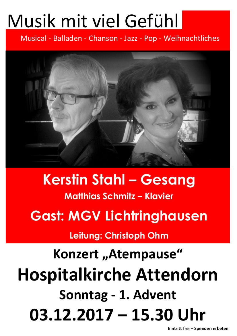Unterstützt wird Kerstin Stahl von Matthias Schmitz am Klavier. Zu Gast ist der MGV Lichtringhausen unter der Leitung von Christoph Ohm.