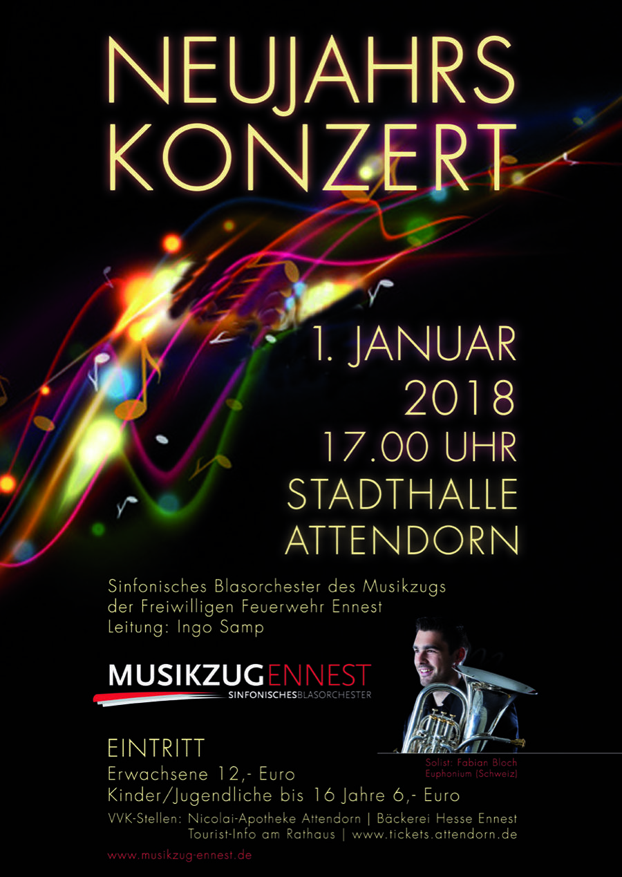 Anlässlich seines 70jährigen Bestehens beginnt das Sinfonische Blasorchester des Musikzuges Ennest das Jubiläumsjahr am 1. Januar 2018 mit einem großen Neujahrskonzert in der Stadthalle Attendorn.