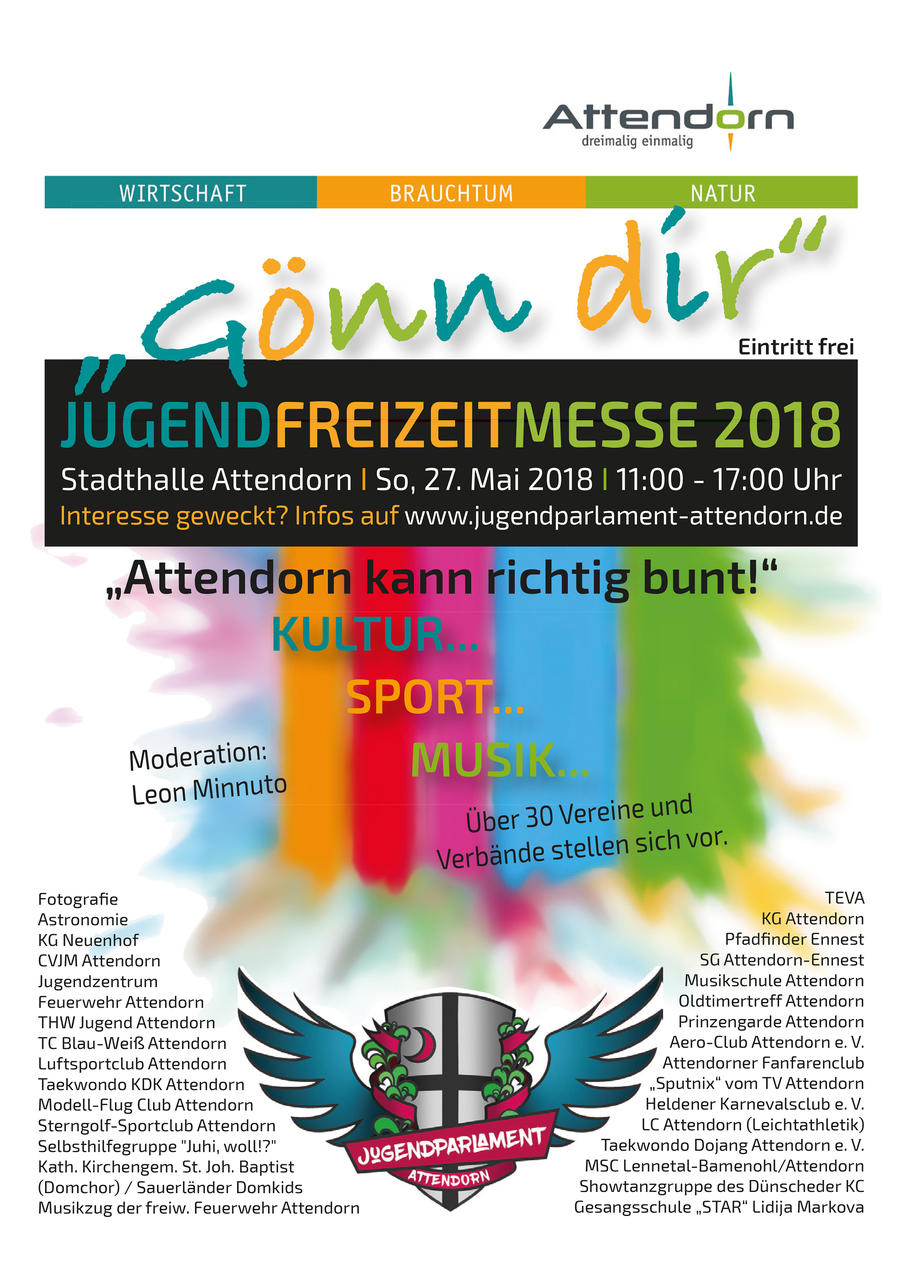 Unter dem Motto „Attendorn kann richtig bunt!“ stellen sich in der Zeit von 11 Uhr bis 17 Uhr über 30 Vereine und Verbände aus der Region vor. Die jugendlichen (und erwachsenen!) Besucher der Messe können sich einen Überblick über das breite kulturelle, sportliche oder musikalische Angebot für Jugendliche verschaffen. Außerdem geben auch Fotografen und Astronomen Einblicke in ihr Hobby.