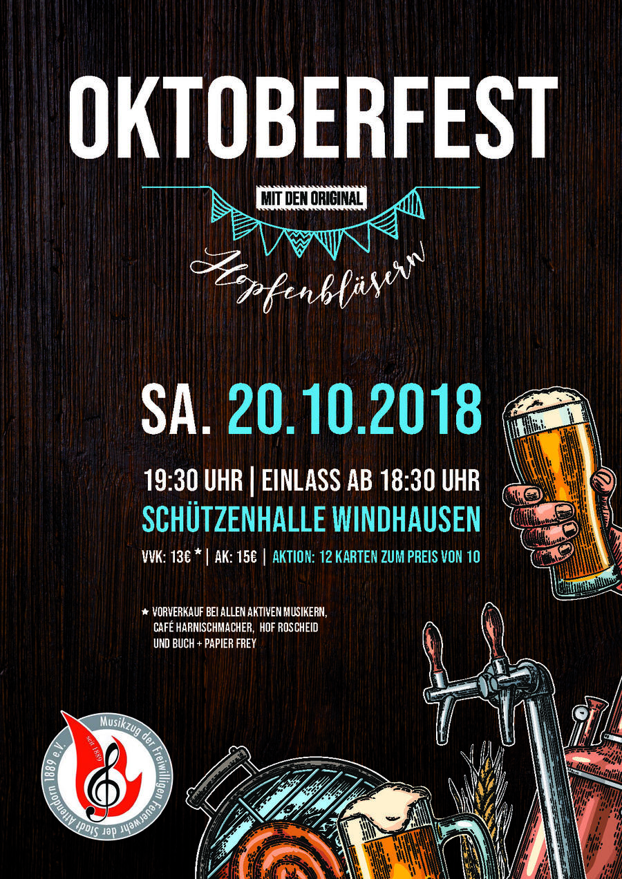 Zum dritten Mal veranstaltet der Musikzug der Freiwilligen Feuerwehr Attendorn ein Oktoberfest. Am Samstag, 20. Oktober 2018, wird ab 19:30 Uhr in der Schützenhalle Windhausen zünftig gefeiert. Der Vorverkauf hat begonnen.